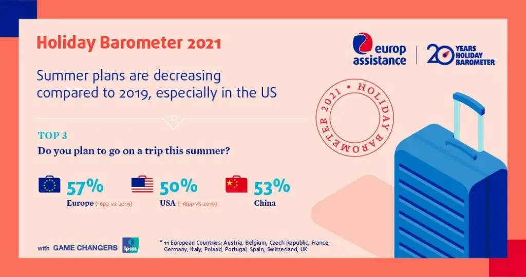 The 2021 edition of the Holiday Barometer from Europ Assistance and Ipsos was conducted in 14 countries including the United States, United Kingdom, Italy, France, Spain, Switzerland, Germany, Austria, Portugal, Belgium, Poland, China and Thailand. In each country, 1,000 consumers aged 18 years and older took part in an online questionnaire. The survey was conducted between May 5th and May 20th and investigated consumer holiday plans and travel preferences